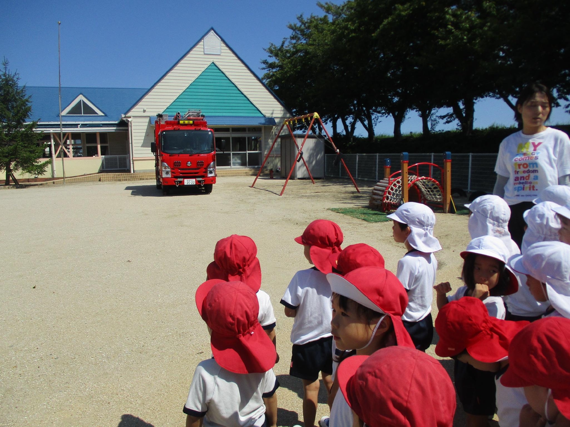 9月3日(水)消防避難訓練が行われました。 地震音が聞こえると、すぐに机の下に隠れ頭を守っていましたよ! 「お・は・し・も」の約束を守り園庭に避難できましたよ👏 消防士さんにもとっても上手でしたよ~と褒めてもらいました😊 いざという時の避難の仕方、命を守る術をしっかり身に着けていきたいですね!!